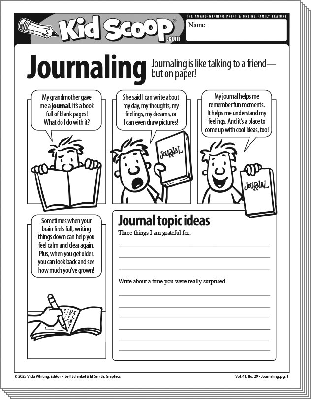 Much of what we know about history is through journals that thoughtful and observant people left behind. A journal is a written record of events, ideas, experiences, travels, and much more! Teachers often provide time during the week for students to write in journals. Sometimes topics are assigned and sometimes students choose topics and write freely. And sometimes students write at home—where topics in personal journals are always your choice! What a powerful tool to remember childhood adventures—and a way for future readers to remember you! This issue will help you get started by providing topic ideas, sentence starters, and practical tips. Learn how to construct a journal and practice on some silly stories as you develop your journaling skills. You may even grow up to be a “journal-ist” or have a career in writing. Write on and you’ll be right on!