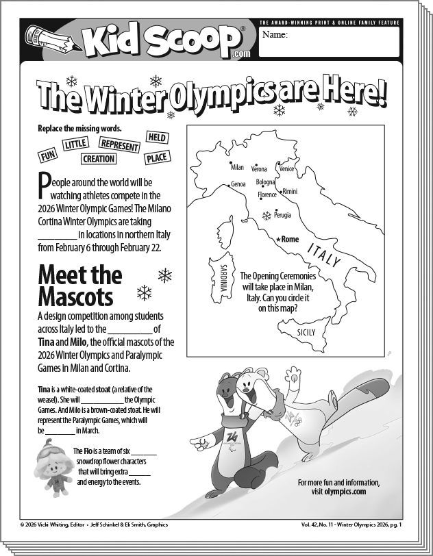 Meet Tina and Milo—two friendly sloats who can’t wait to be your guides! They’re the official mascots of the 2026 Olympic and Paralympic Winter Games, happening in Italy from February 6–22. For 17 exciting days, the world will come together for opening ceremonies, thrilling races, and amazing competition as international athletes compete in winter sports like figure skating, bobsleigh, and ice hockey. These athletes represent the very best of their nations, showing commitment, determination, patriotism, and sportsmanship. Along the way, national flags, team colors, and background stories will help students discover how countries around the world are different—and how they are alike, too. So grab your scarf and mittens and join us as we head to Italy to make unforgettable Winter Olympic memories!
